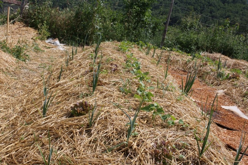 Elemento importantissimo e immancabile nell’agricoltura sinergica è la pacciamatura che protegge il suolo dal compattamento e dall’azione eccessiva di sole, pioggia e vento. Inoltre facilita lo sviluppo di microflora e microfauna, in particolare dei lombrichi. La pacciamatura agisce come un “tampone termico”, proteggendo il suolo sia nei mesi più caldi, sia durante la stagione fredda. Ovviamente deve essere realizzata con materiali biodegradabili e a seconda delle esigenze: paglia, sfalci dei prati, canne, foglie, segatura non trattata, carta, ecc.