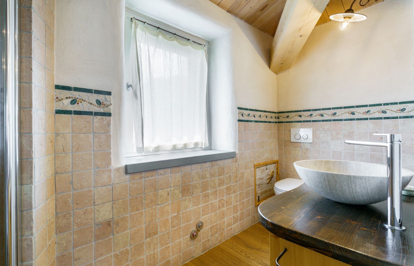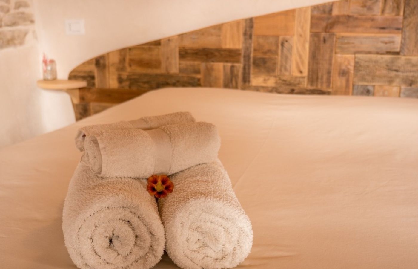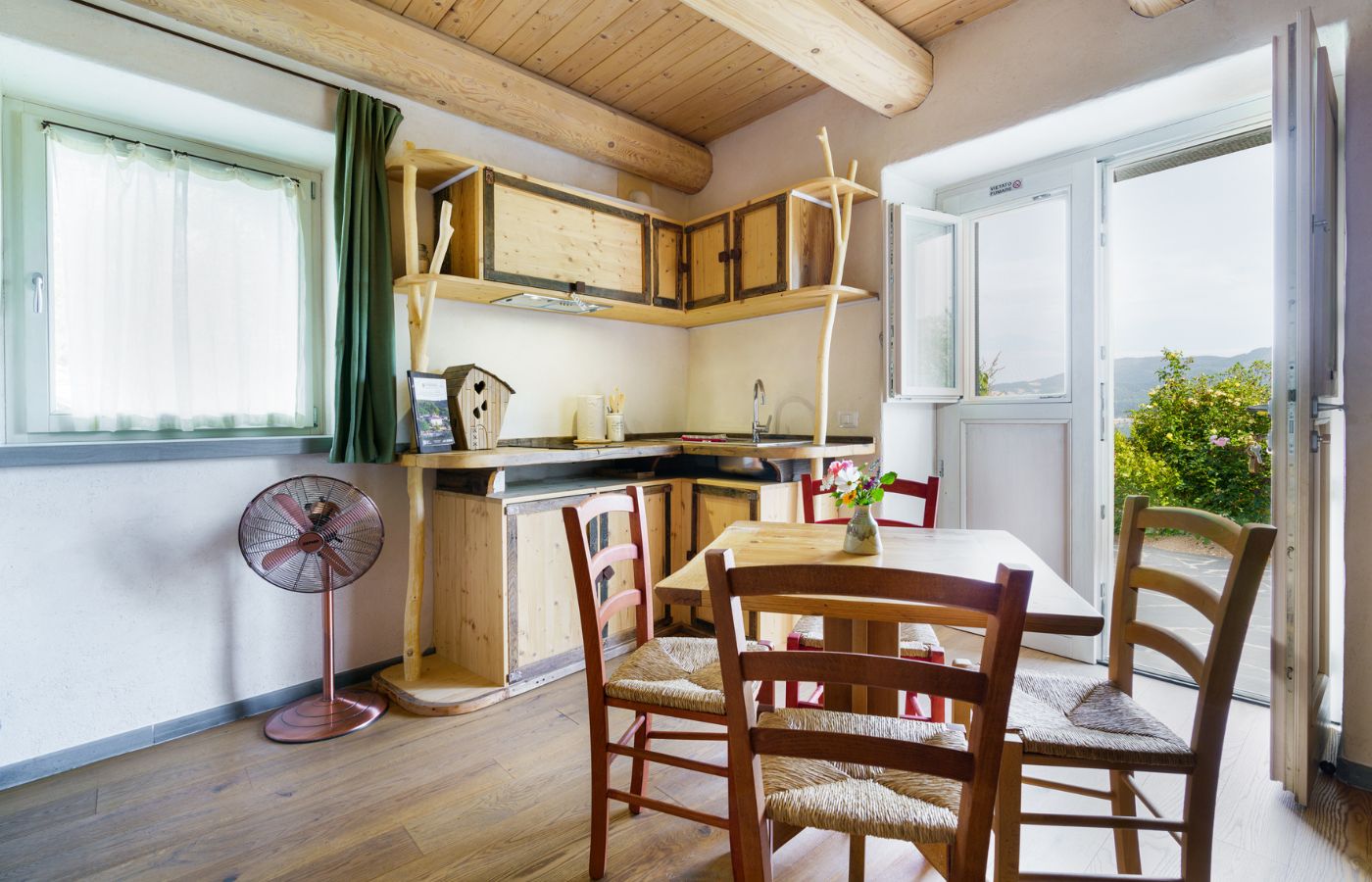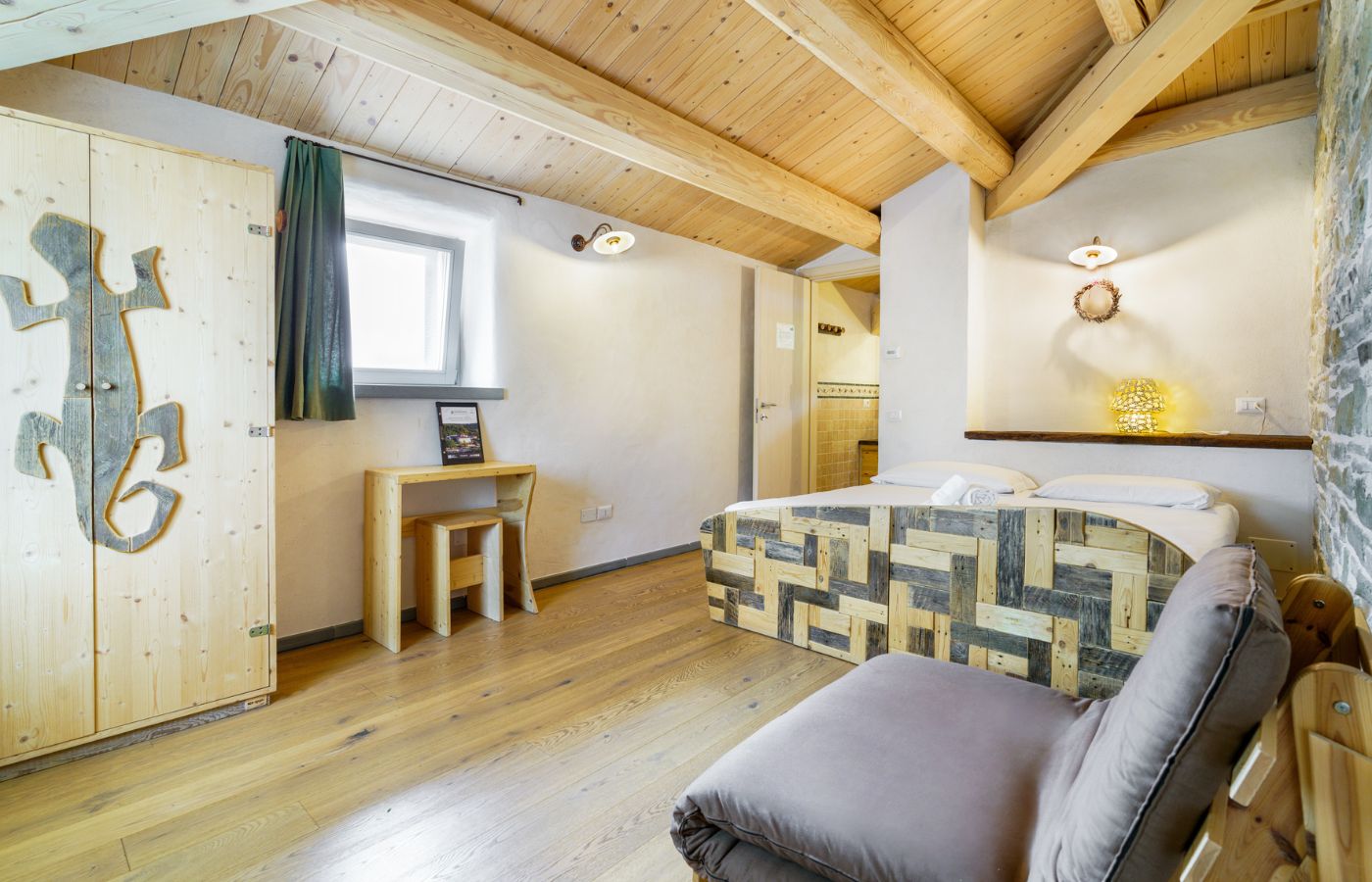 Il monolocale Bosco si trova al piano inferiore della struttura principale con accesso indipendente dall’esterno. Lo stile è quello di tutto l’edificio caratterizzato da muri intonacati in calce-canapa, soffitto con travi in legno a vista, pavimento e mobili in legno naturale.