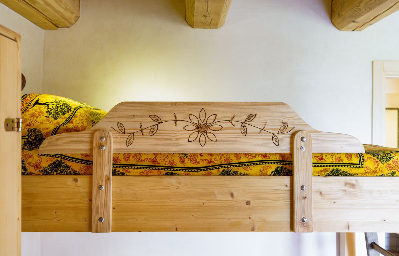 La camera Albero si trova al primo piano della struttura principale con accesso dalla scala interna. Lo stile è quello di tutto l’edificio, caratterizzato da muri intonacati in calce-canapa, soffitto con travi in legno a vista, pavimento e mobili in legno naturale.