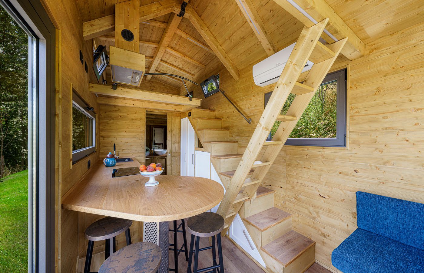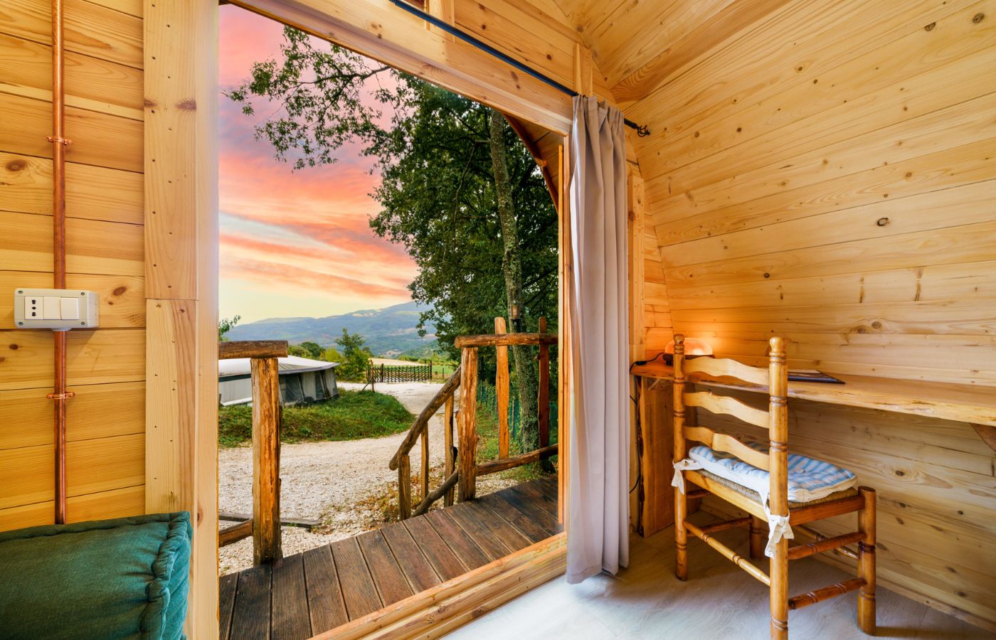 La Tiny House Gloria di 24 mq, Made in Italy, regolarmente omologata, si trova all’interno dell’agricampeggio in un ampio giardino recintato e fornito di sdraie in legno, per garantire pace e relax.