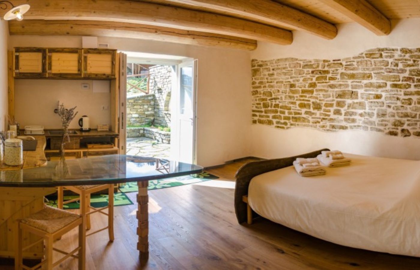 Il monolocale Luna si trova al piano inferiore della struttura principale ed ha il proprio ingresso indipendente. Lo stile è quello di tutto l’edificio caratterizzato da muri in pietra e in calce-canapa, soffitto con travi in legno a vista, pavimento e mobili in legno naturale.