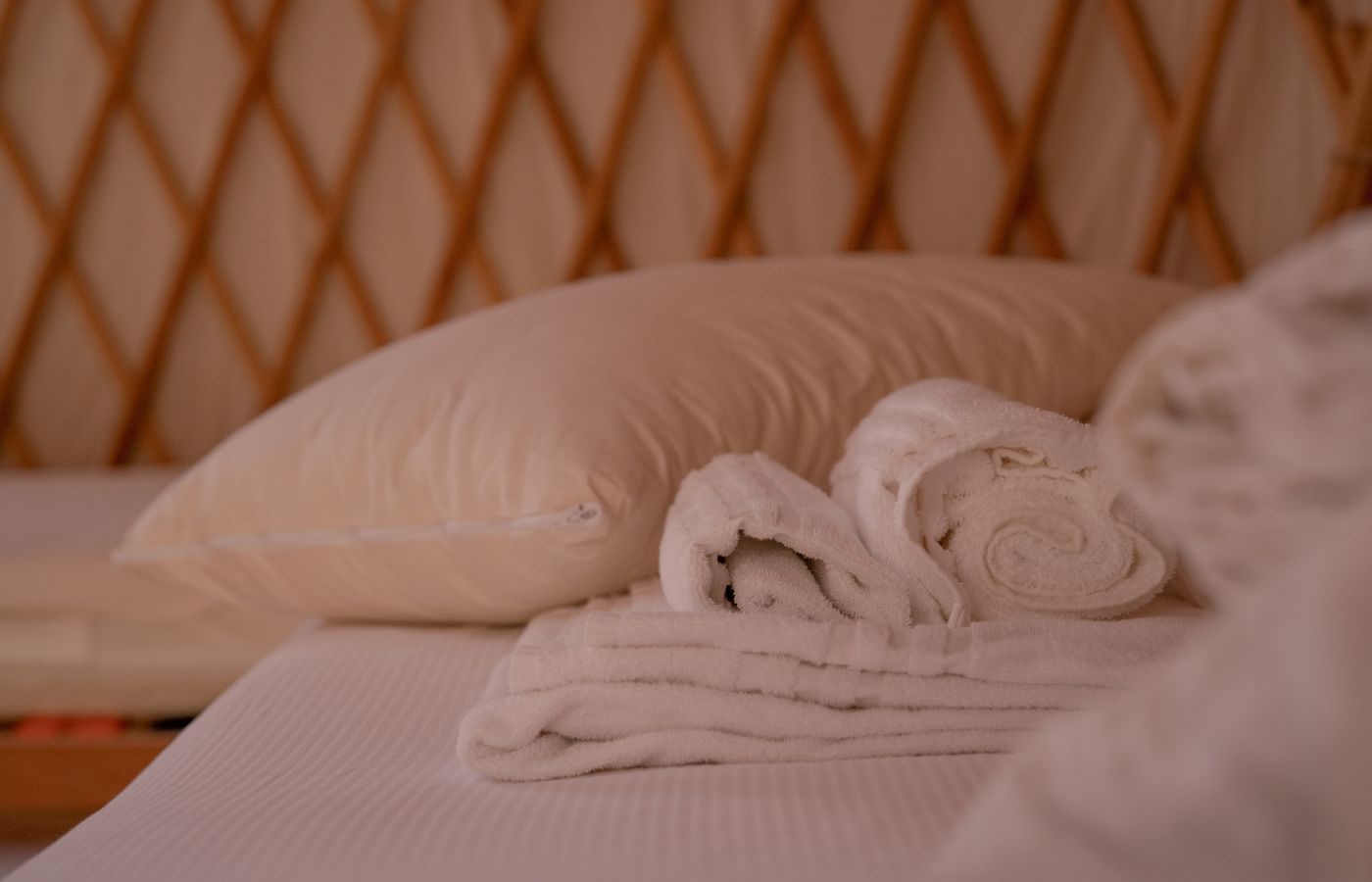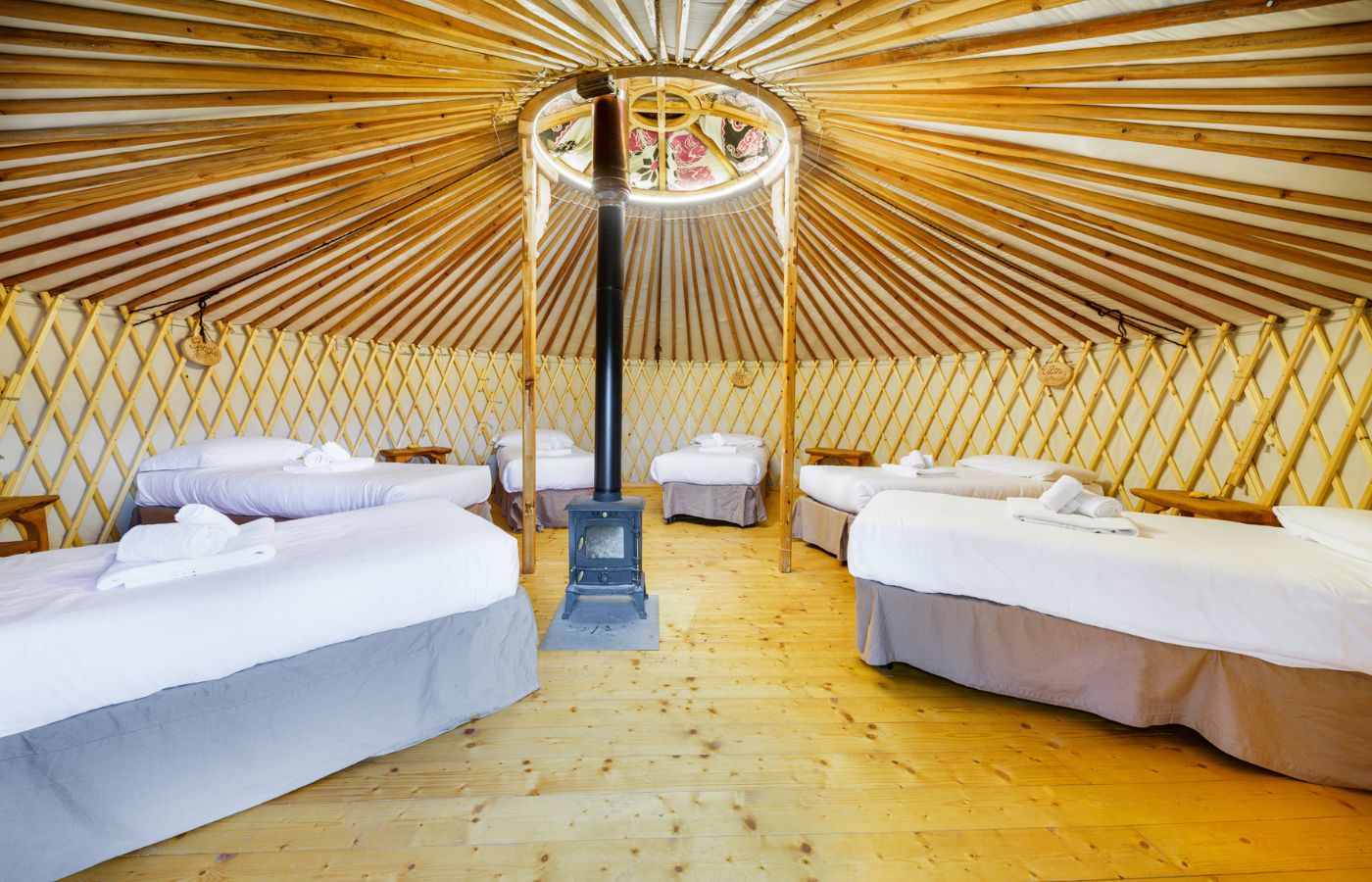 Le yurte della Fattoria sono spazi semplici e accoglienti, con pavimento in legno naturale e illuminazione a LED, pensati per offrire comfort essenziale e quiete.