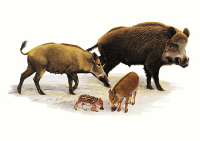 Caratteristico del cinghiale è anche il muso con il grugno (grifo) cartilagineo che utilizza per rivoltare il terreno in cerca di radici.