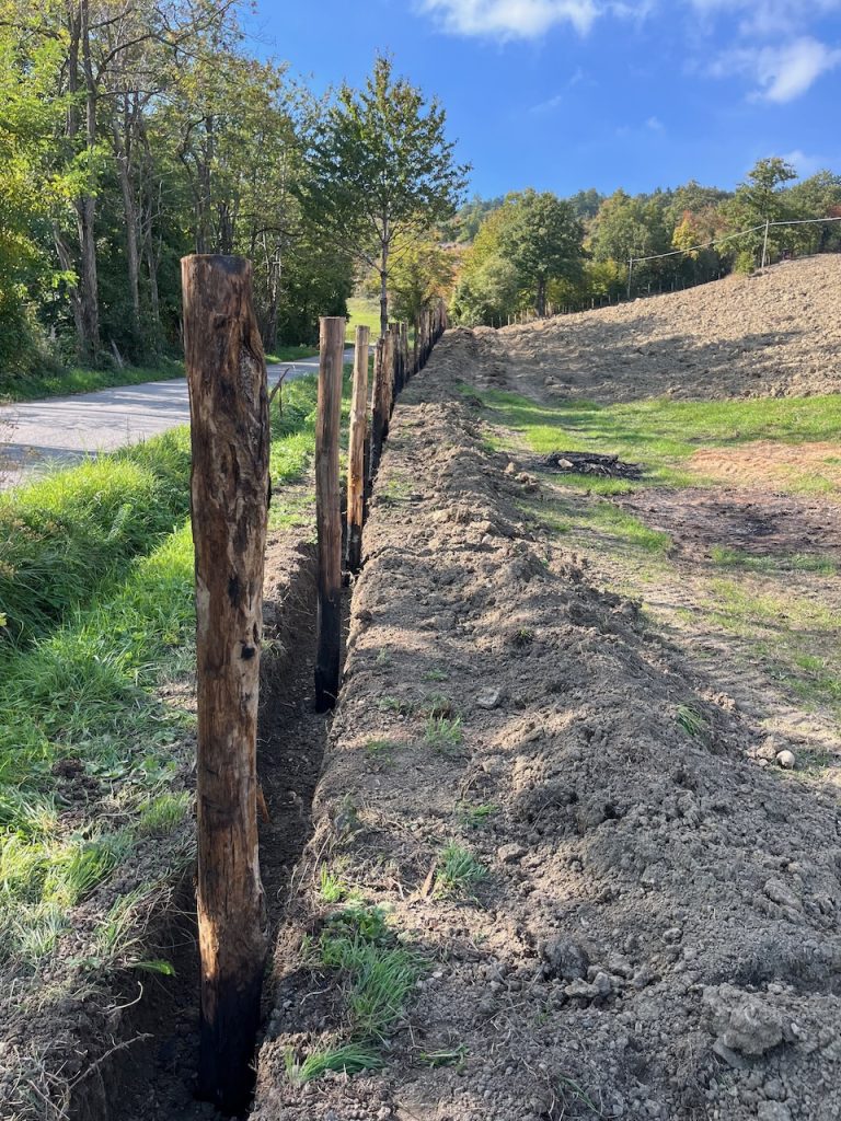 Nel 2011, notando i limiti della prima recinzione fatta per proteggere il frutteto e l’orto, abbiamo deciso di realizzare la prima recinzione fissa in rete metallica a maglie sciolte abbinata a pali di castagno del diametro di circa 12 cm, per proteggere 2ha intorno al centro aziendale.