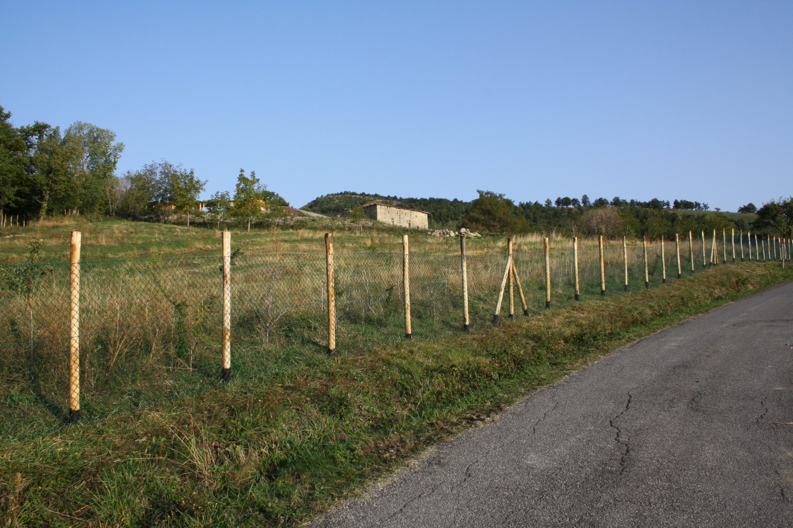 In 2011, noticing the limitations of the first fence built to protect the orchard and vegetable garden, we decided to create the first fixed fence in loose-mesh metal netting combined with chestnut posts approximately 12 cm in diameter, to protect 2 hectares around the farm centre.
