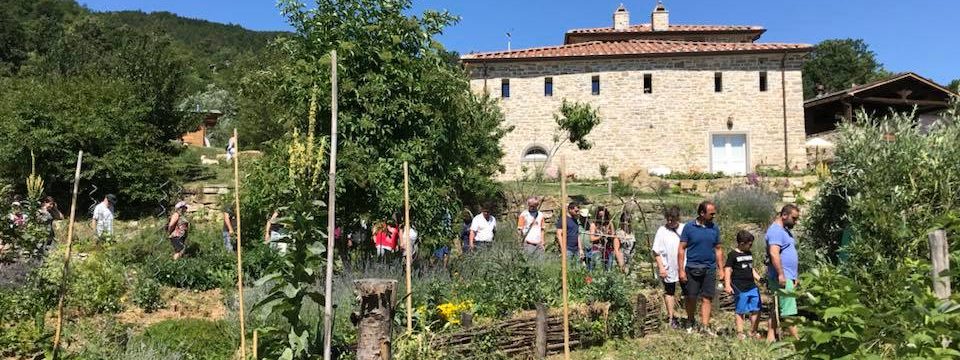 Dal piazzale di fronte all’ingresso del bio-agriturismo saliremo verso la FoodForest e i terrazzamenti di erbe aromatiche, passando dalle postazioni per le arnie brulicanti di api. Verranno mostrati gli swales (fossi livellari) e il sistema idrico della Fattoria. Dall’alto potremo godere di una vista sui campi seminativi di cereali antichi, sui ciliegi e le piante da frutto di ogni tipo e varietà. Tornando verso il piazzale sarà possibile vedere la Yurta e la cantina dove vengono tenuti i semi e il raccolto di patate, mele e pere. Passeremo fra i muri a secco e l’orto sinergico per poi attraversare la strada e visitare la policoltura su terrazzamento di piante da frutto, frutti di bosco, aromatiche, viti e ortaggi e l’orto bio-intensivo.