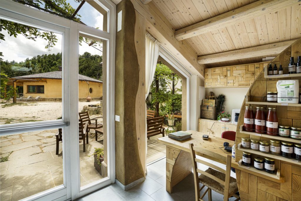 La paglia, scarto della mietitura del grano, è stata utilizzata per realizzare l’edificio della sala ottagonale e dell’agricampeggio, oltre che nell’impasto del forno in terra cruda.
